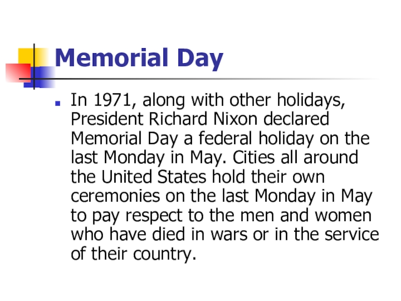 Memorial Day a federal holiday on the last Monday in May. Cities all around the United States hold their own ceremonies on the last Monday in May to pay respect to the men and women who have died in wars or in the service of their country.