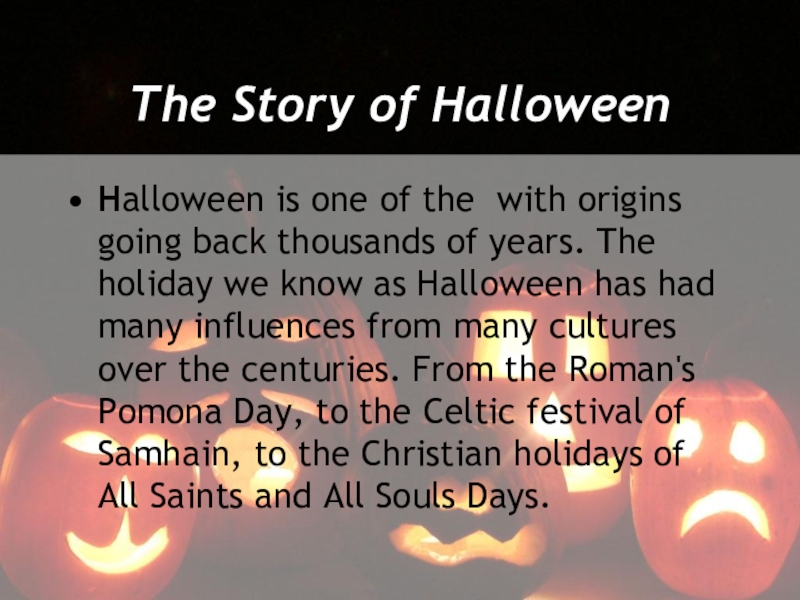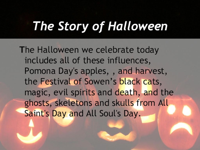 of these influences, Pomona Day's apples, , and harvest, the Festival of Sowen’s black cats, magic, evil spirits and death, and the ghosts, skeletons and skulls from All Saint's Day and All Soul's Day.
