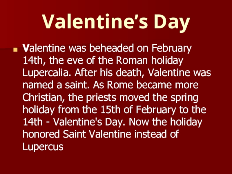 Roman holiday Lupercalia. After his death, Valentine was named a saint. As Rome became more Christian, the priests moved the spring holiday from the 15th of February to the 14th - Valentine's Day. Now the holiday honored Saint Valentine instead of Lupercus