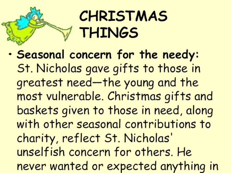 in greatest need—the young and the most vulnerable. Christmas gifts and baskets given to those in need, along with other seasonal contributions to charity, reflect St. Nicholas' unselfish concern for others. He never wanted or expected anything in return.