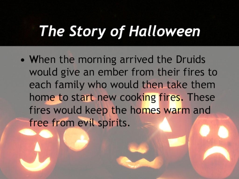harvested and stored for the long winter the cooking fires in the homes would be extinguished. The Druids, the Celtic priests, would meet in the hilltop in the dark oak forest (oak trees were considered sacred). The Druids would light new fires and offer sacrifices of crops and animals. As they danced around the the fires, the season of the sun passed and the season of darkness would begin.
