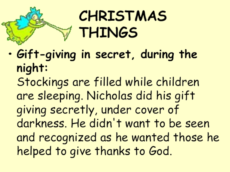 are sleeping. Nicholas did his gift giving secretly, under cover of darkness. He didn't want to be seen and recognized as he wanted those he helped to give thanks to God.