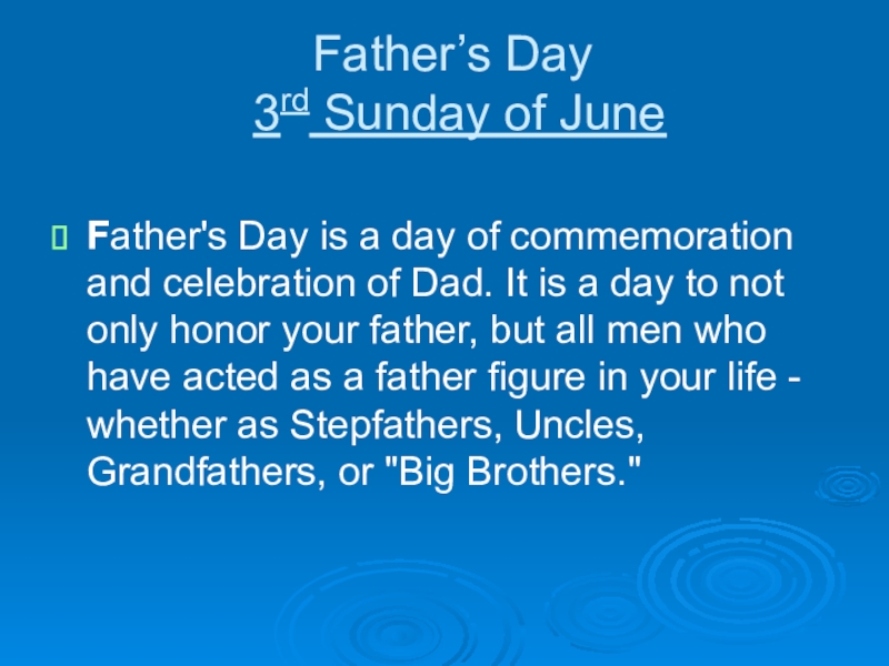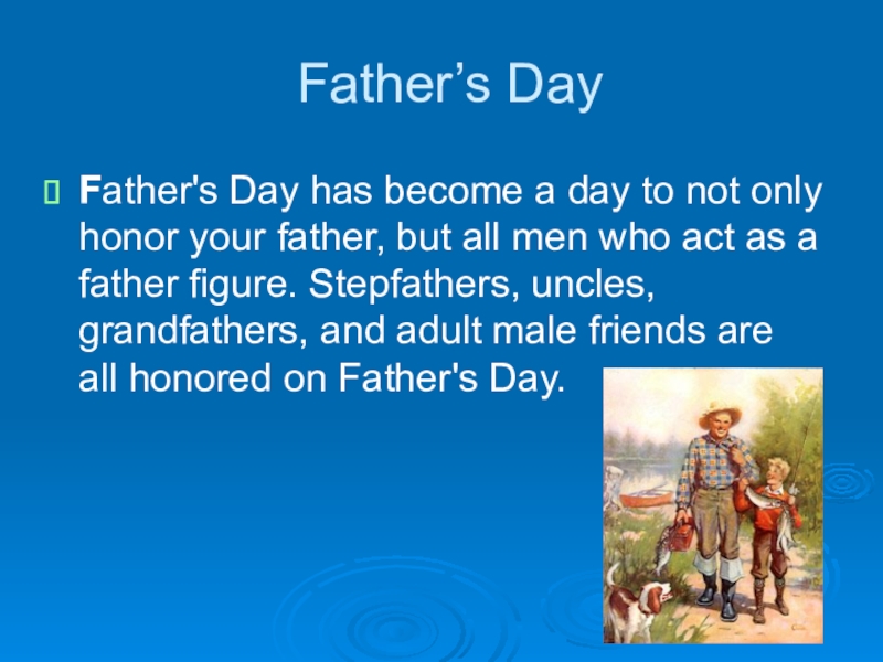your father, but all men who act as a father figure. Stepfathers, uncles, grandfathers, and adult male friends are all honored on Father's Day.