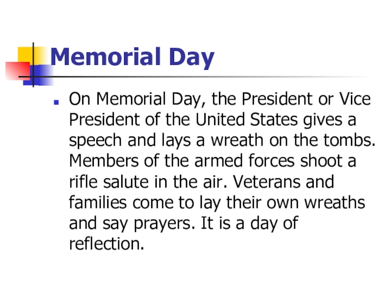 United States gives a speech and lays a wreath on the tombs. Members of the armed forces shoot a rifle salute in the air. Veterans and families come to lay their own wreaths and say prayers. It is a day of reflection.
