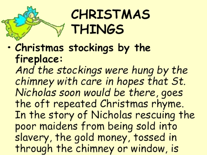 the chimney with care in hopes that St. Nicholas soon would be there, goes the oft repeated Christmas rhyme. In the story of Nicholas rescuing the poor maidens from being sold into slavery, the gold money, tossed in through the chimney or window, is said to have landed in stockings left to dry before the fire.