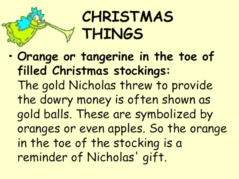 gold Nicholas threw to provide the dowry money is often shown as gold balls. These are symbolized by oranges or even apples. So the orange in the toe of the stocking is a reminder of Nicholas' gift.