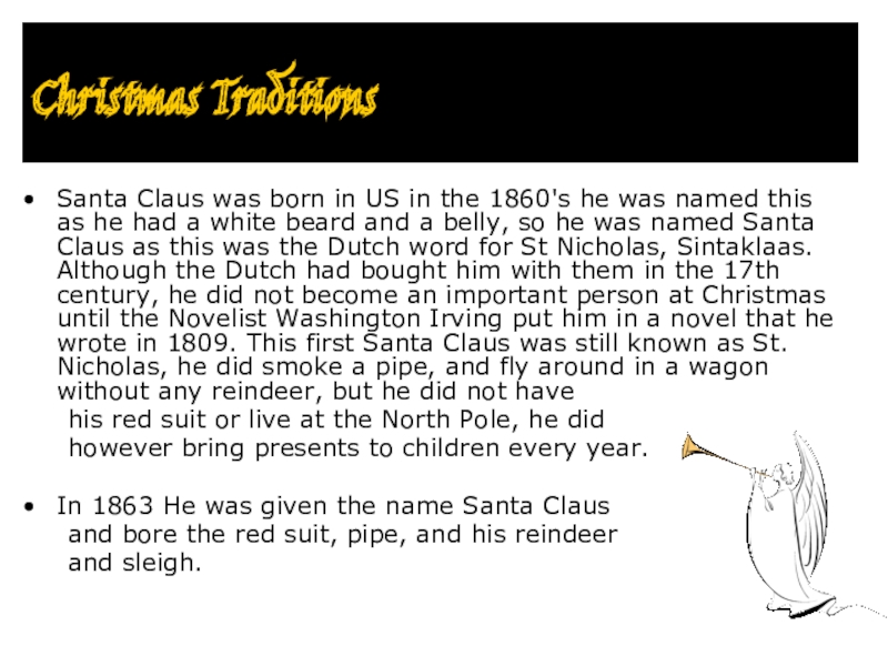 was named this as he had a white beard and a belly, so he was named Santa Claus as this was the Dutch word for St Nicholas, Sintaklaas. Although the Dutch had bought him with them in the 17th century, he did not become an important person at Christmas until the Novelist Washington Irving put him in a novel that he wrote in 1809. This first Santa Claus was still known as St. Nicholas, he did smoke a pipe, and fly around in a wagon without any reindeer, but he did not have