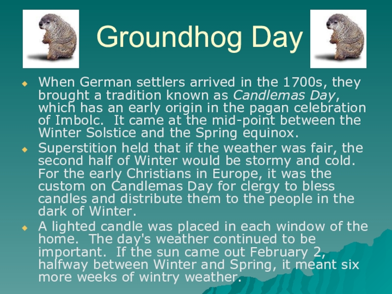 A lighted candle was placed in each window of the home. The day's weather continued to be important. If the sun came out February 2, halfway between Winter and Spring, it meant six more weeks of wintry weather.