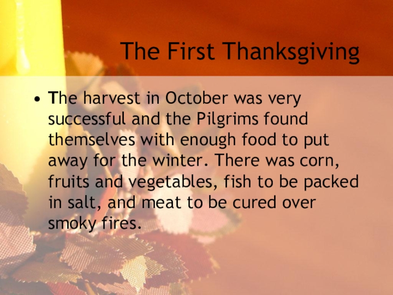 Pilgrims found themselves with enough food to put away for the winter. There was corn, fruits and vegetables, fish to be packed in salt, and meat to be cured over smoky fires.