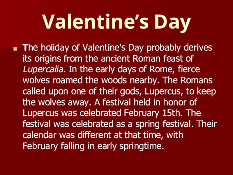 the ancient Roman feast of Lupercalia. In the early days of Rome, fierce wolves roamed the woods nearby. The Romans called upon one of their gods, Lupercus, to keep the wolves away. A festival held in honor of Lupercus was celebrated February 15th. The festival was celebrated as a spring festival. Their calendar was different at that time, with February falling in early springtime.