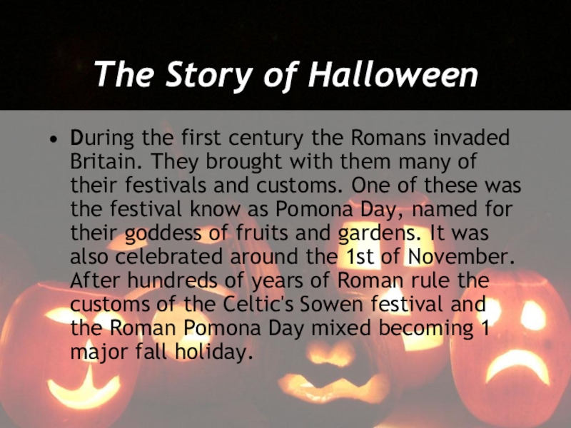 They brought with them many of their festivals and customs. One of these was the festival know as Pomona Day, named for their goddess of fruits and gardens. It was also celebrated around the 1st of November. After hundreds of years of Roman rule the customs of the Celtic's Sowen festival and the Roman Pomona Day mixed becoming 1 major fall holiday.