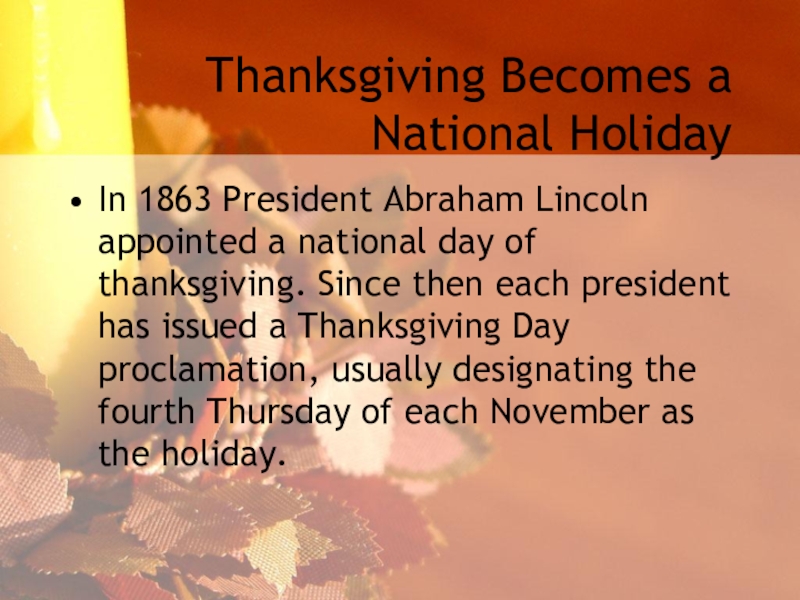 national day of thanksgiving. Since then each president has issued a Thanksgiving Day proclamation, usually designating the fourth Thursday of each November as the holiday.