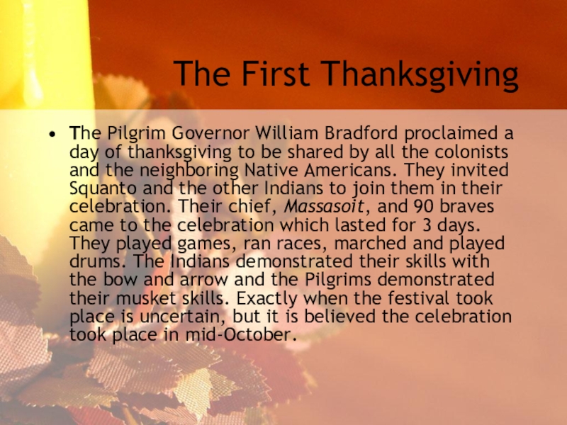 thanksgiving to be shared by all the colonists and the neighboring Native Americans. They invited Squanto and the other Indians to join them in their celebration. Their chief, Massasoit, and 90 braves came to the celebration which lasted for 3 days. They played games, ran races, marched and played drums. The Indians demonstrated their skills with the bow and arrow and the Pilgrims demonstrated their musket skills. Exactly when the festival took place is uncertain, but it is believed the celebration took place in mid-October.