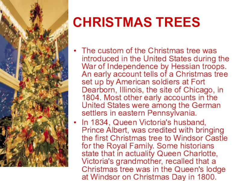 United States during the War of Independence by Hessian troops. An early account tells of a Christmas tree set up by American soldiers at Fort Dearborn, Illinois, the site of Chicago, in 1804. Most other early accounts in the United States were among the German settlers in eastern Pennsylvania.