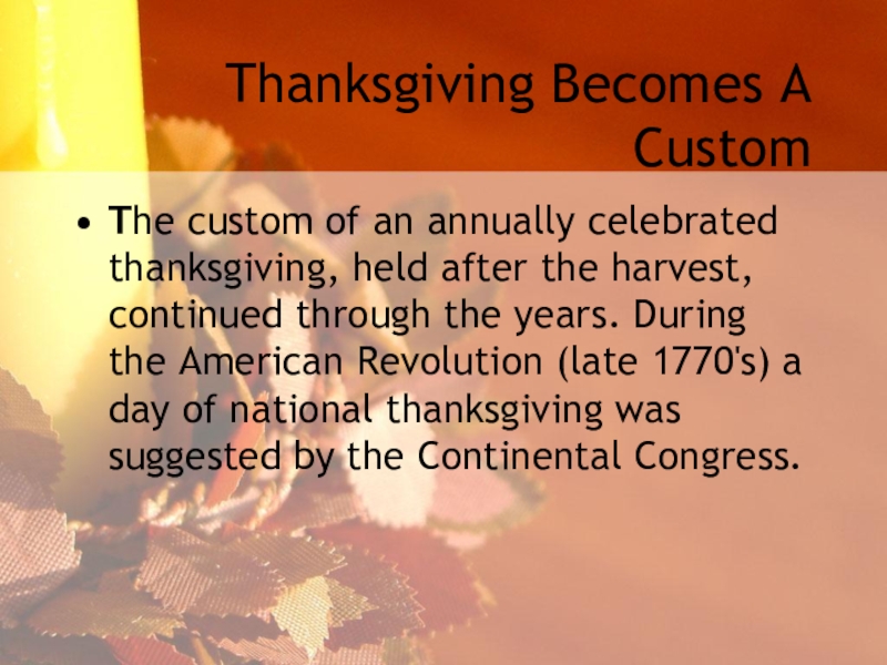 after the harvest, continued through the years. During the American Revolution (late 1770's) a day of national thanksgiving was suggested by the Continental Congress.