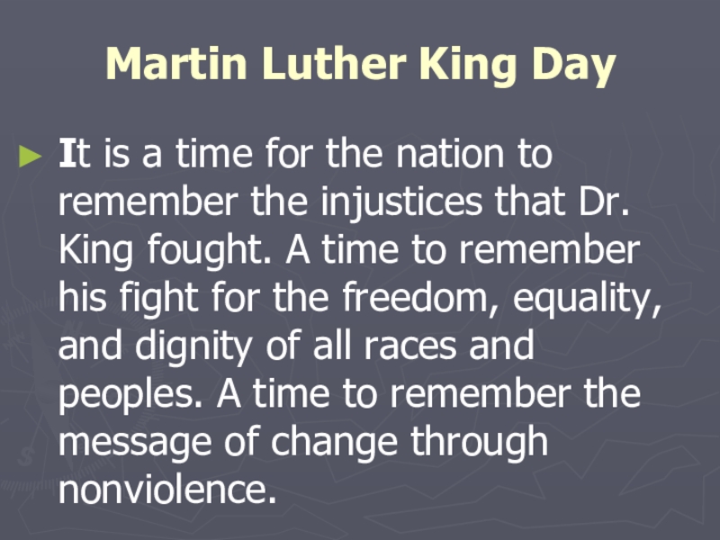 remember the injustices that Dr. King fought. A time to remember his fight for the freedom, equality, and dignity of all races and peoples. A time to remember the message of change through nonviolence.