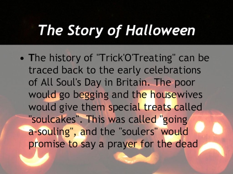 to the early celebrations of All Soul's Day in Britain. The poor would go begging and the housewives would give them special treats called "soulcakes". This was called "going a-souling", and the "soulers" would promise to say a prayer for the dead