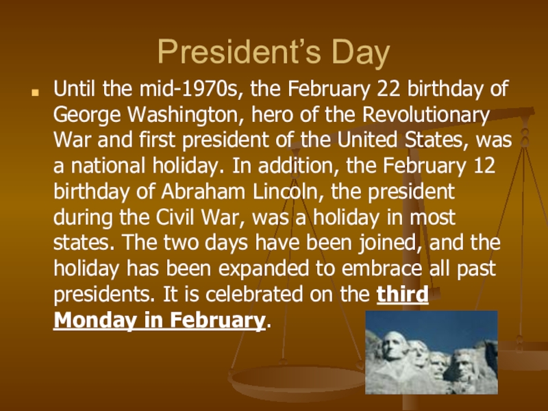 hero of the Revolutionary War and first president of the United States, was a national holiday. In addition, the February 12 birthday of Abraham Lincoln, the president during the Civil War, was a holiday in most states. The two days have been joined, and the holiday has been expanded to embrace all past presidents. It is celebrated on the third Monday in February.