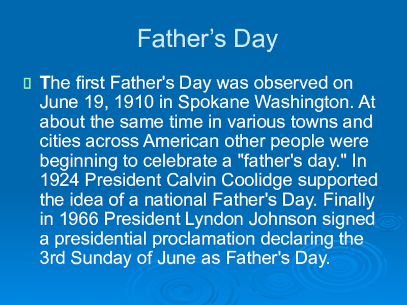 in Spokane Washington. At about the same time in various towns and cities across American other people were beginning to celebrate a "father's day." In 1924 President Calvin Coolidge supported the idea of a national Father's Day. Finally in 1966 President Lyndon Johnson signed a presidential proclamation declaring the 3rd Sunday of June as Father's Day.