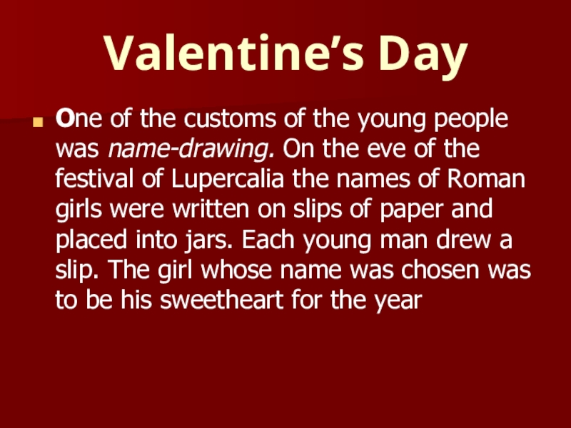 On the eve of the festival of Lupercalia the names of Roman girls were written on slips of paper and placed into jars. Each young man drew a slip. The girl whose name was chosen was to be his sweetheart for the year