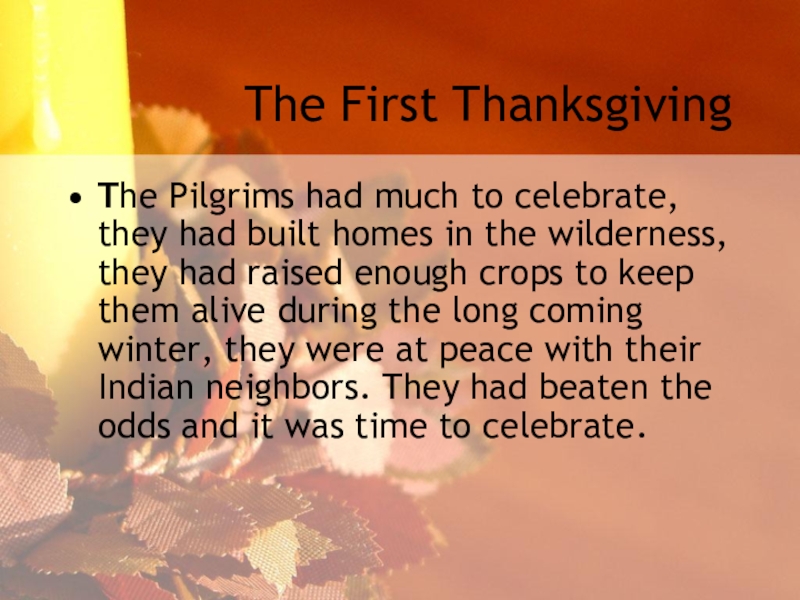 homes in the wilderness, they had raised enough crops to keep them alive during the long coming winter, they were at peace with their Indian neighbors. They had beaten the odds and it was time to celebrate.