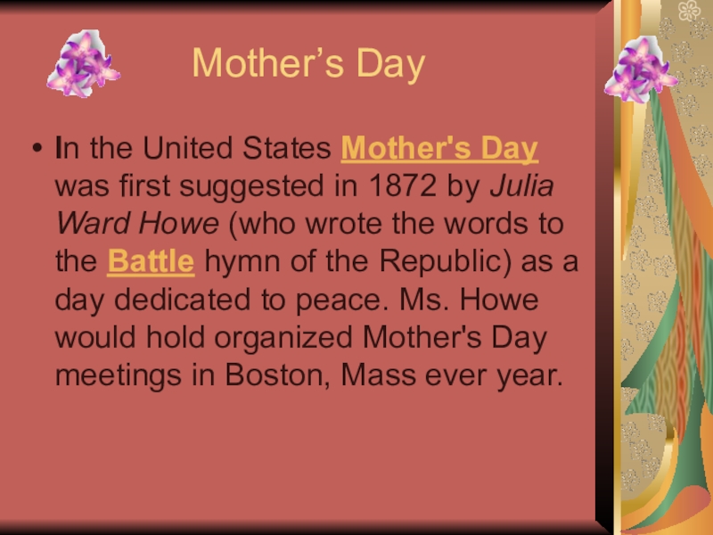 by Julia Ward Howe (who wrote the words to the Battle Hymn of the Republic) as a day dedicated to peace. Ms. Howe would hold organized Mother's Day meetings in Boston, Mass ever year.