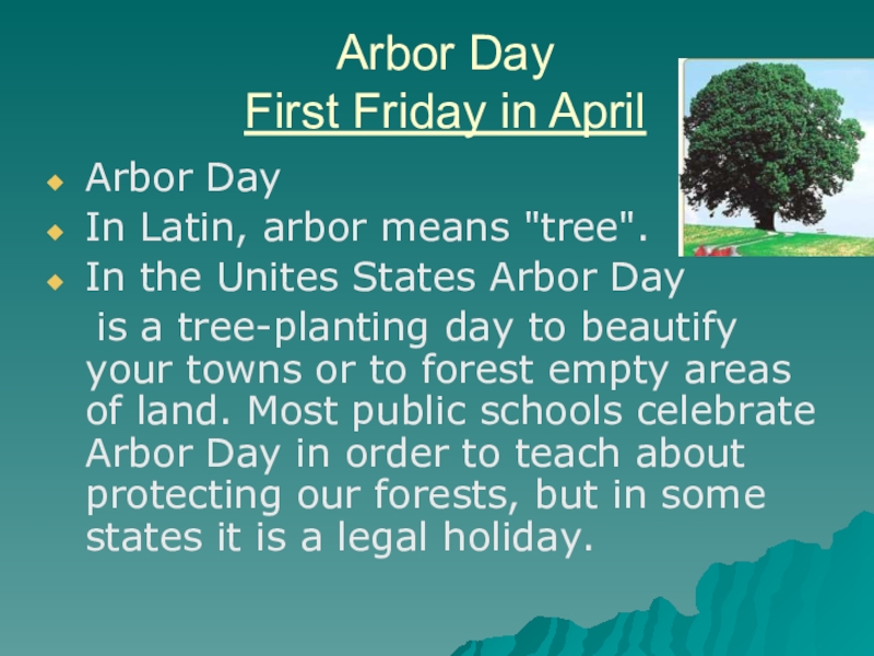 is a tree-planting day to beautify your towns or to forest empty areas of land. Most public schools celebrate Arbor Day in order to teach about protecting our forests, but in some states it is a legal holiday.