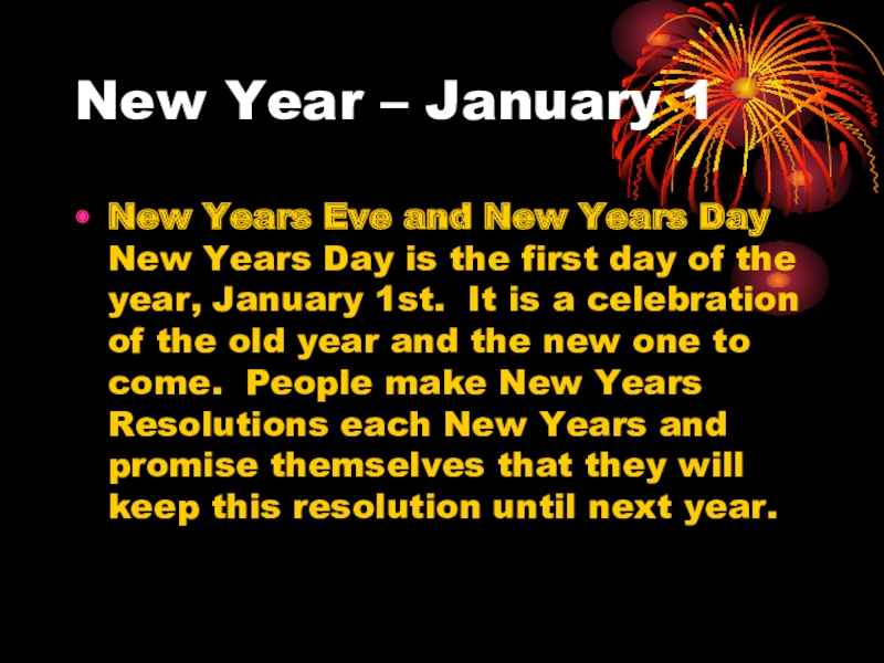New Years Day is the first day of the year, January 1st. It is a celebration of the old year and the new one to come. People make New Years Resolutions each New Years and promise themselves that they will keep this resolution until next year.