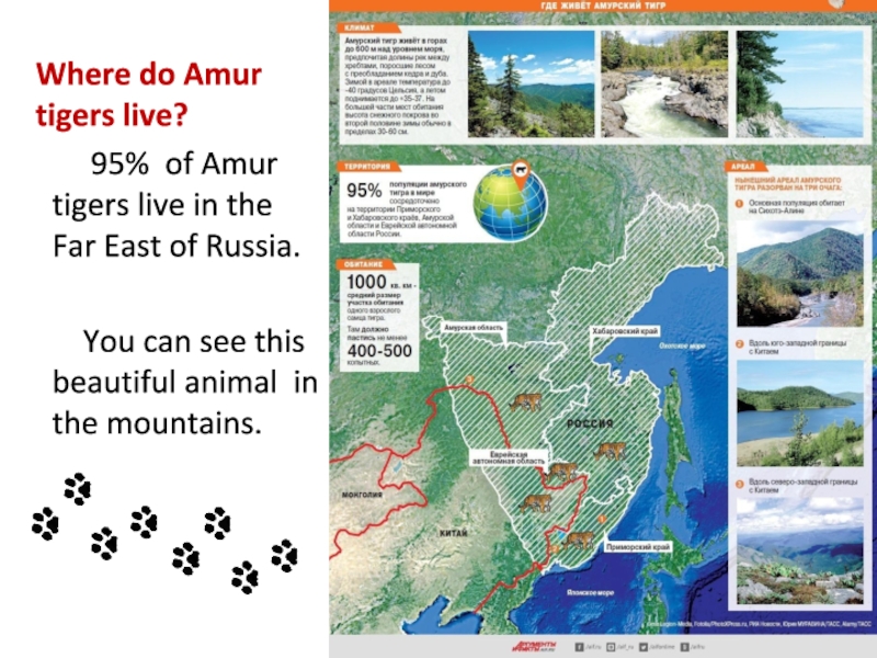 Where do Amur tigers live?   95% of Amur tigers live in the Far East of