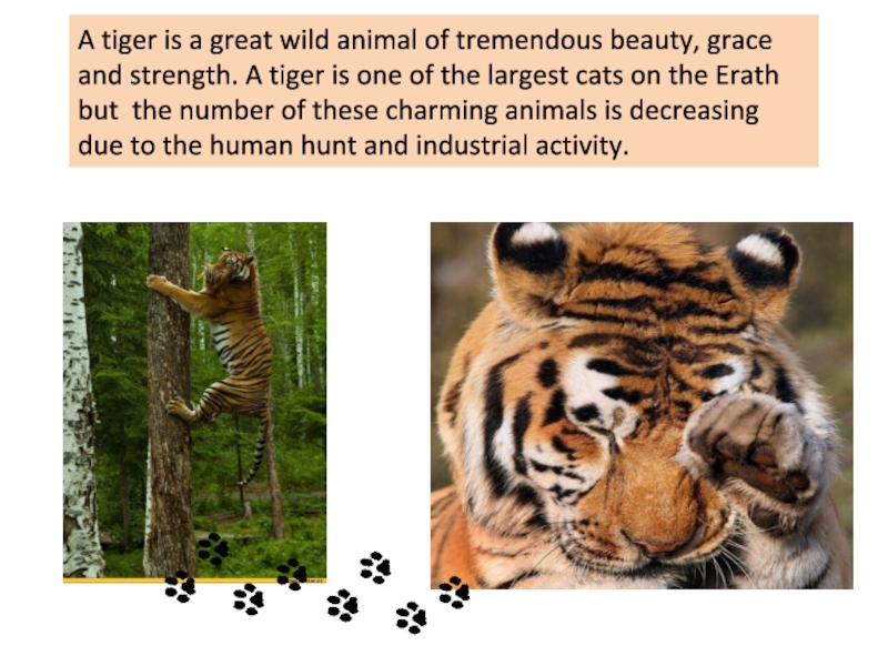 and strength. A tiger is one of the largest cats on the Erath but the number of these charming animals is decreasing due to the human hunt and industrial activity.