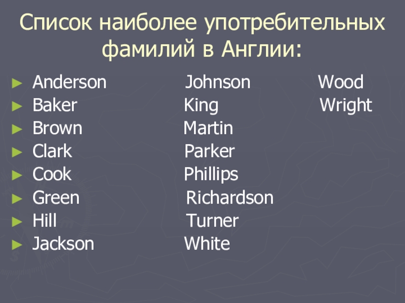 Слайд 4Список наиболее употребительных фамилий в Англии: