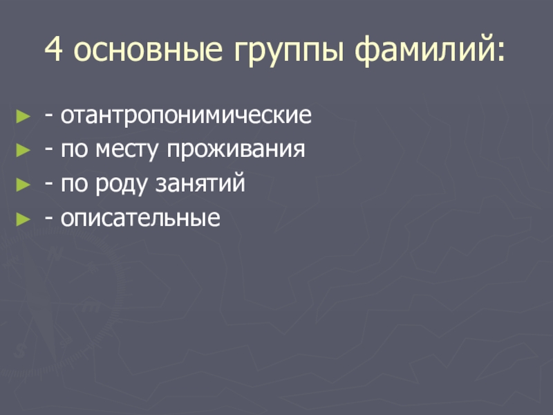 4 основные группы фамилий:- отантропонимические- по месту проживания- по роду занятий- описательные
