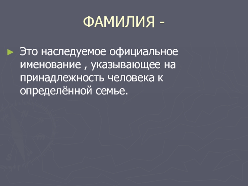 ФАМИЛИЯ -Это наследуемое официальное именование , указывающее на принадлежность человека к определённой семье.