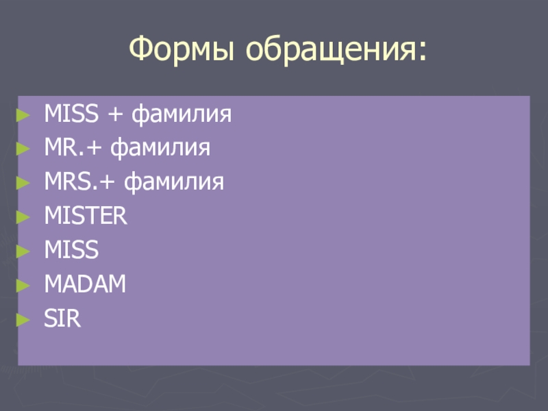 Формы обращения:MISS + фамилияMR.+ фамилияMRS.+ фамилияMISTERMISSMADAMSIR