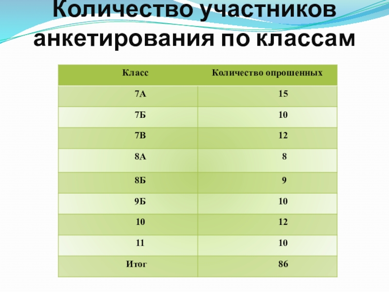 Слайд 4Количество участников анкетирования по классам