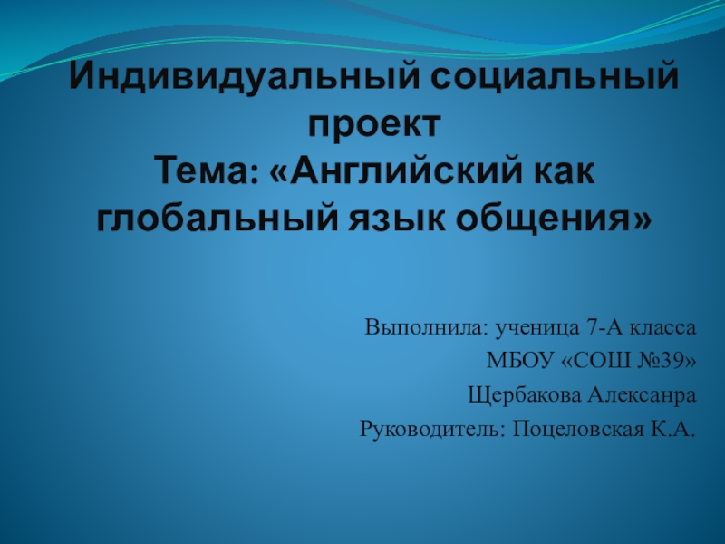 Слайд 1 Индивидуальный социальный проект Тема: «Английский как глобальный язык общения»