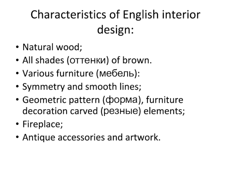 Characteristics of English interior design:Natural wood;All shades (оттенки) of brown.Various furniture (мебель):Symmetry and smooth lines;Geometric pattern (форма),