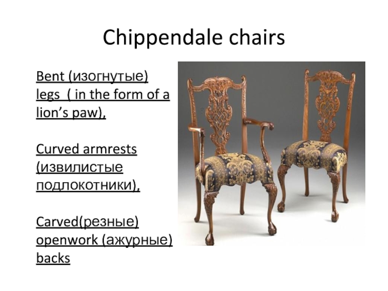 Chippendale chairsBent (изогнутые) legs ( in the form of a lion’s paw), Curved armrests (извилистые подлокотники), Carved(резные)