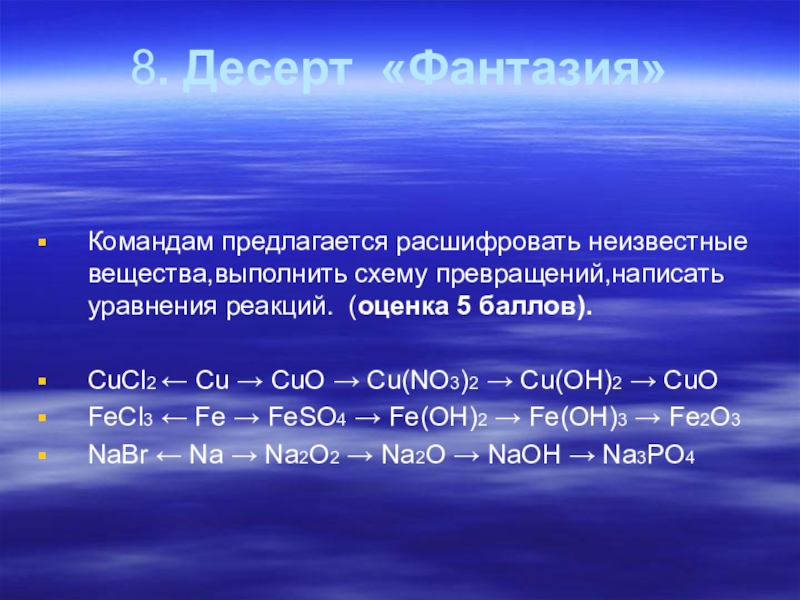 Командам предлагается расшифровать неизвестные вещества,выполнить схему превращений,написать уравнения