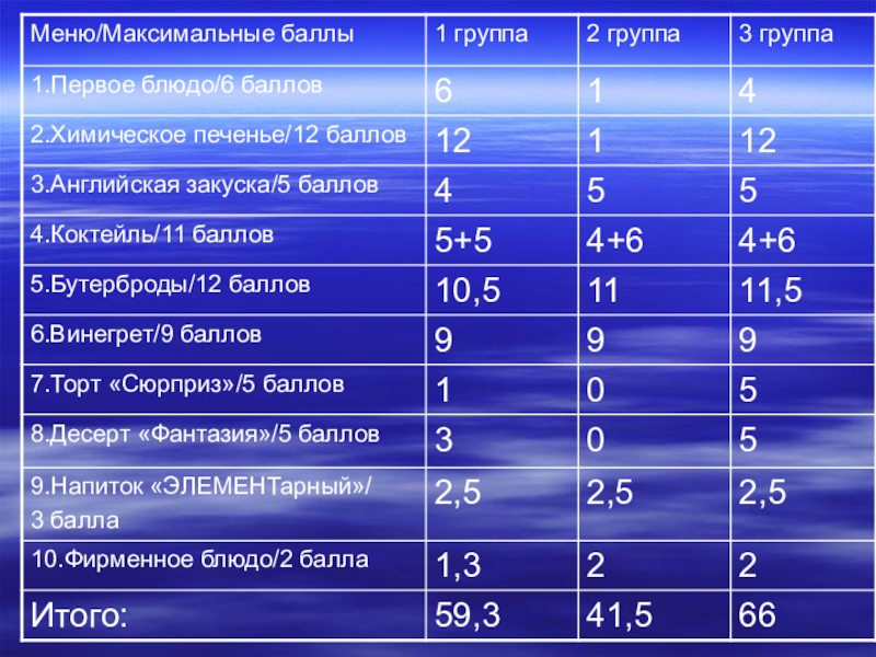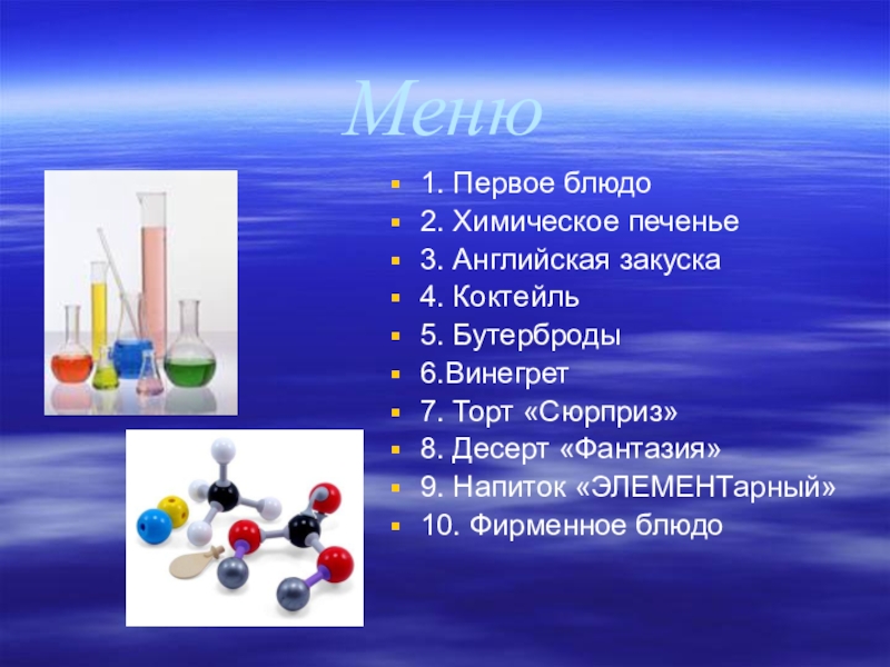 Сегодня мы с вами продолжим работу с уже знакомой вам таблицей Д.И.Менделеева в немного необычной обстановке. Мы посетим англо-химическое кафе, где подаются блюда для закрепления знаний Периодического закона и периодической системы. Это кафе необычно ещё и тем, что за блюда платят посетителям, а не наоборот. Итак, ознакомьтесь с меню нашего кафе.