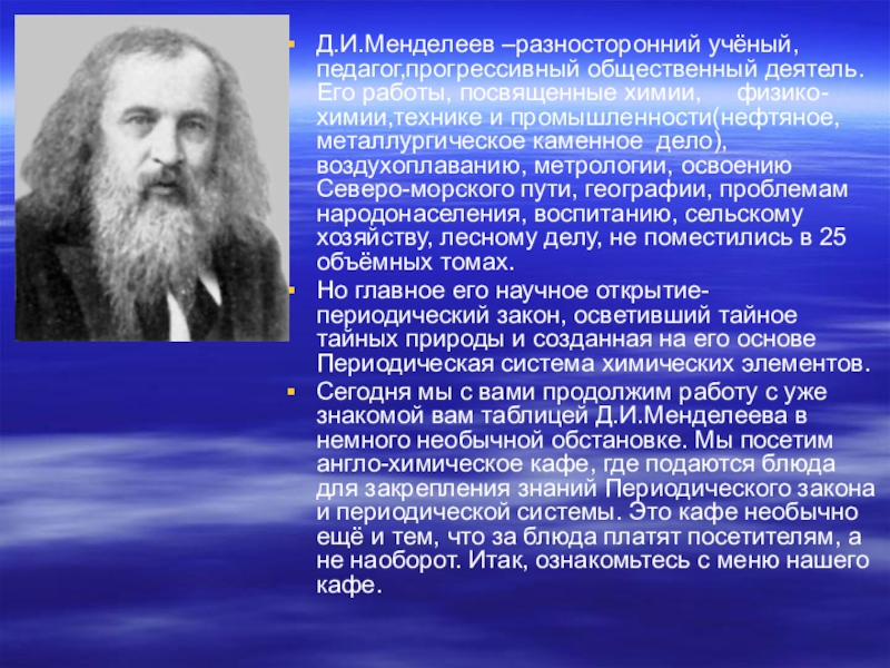 Слайд 2Д.И.Менделеев –разносторонний учёный,педагог,прогрессивный общественный деятель. Его работы, посвященные химии,