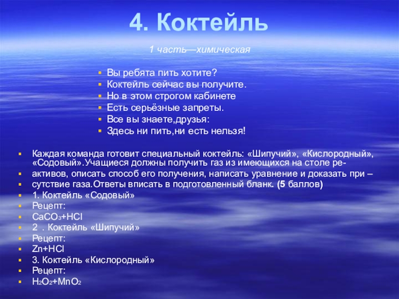 Каждая команда готовит специальный коктейль: «Шипучий», «Кислородный», «Содовый».Учащиеся должны получить газ из имеющихся на столе ре-
