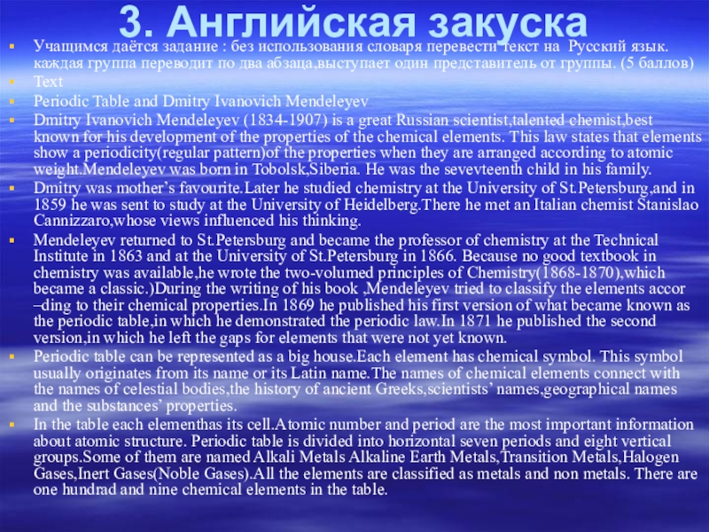 на Русский язык.каждая группа переводит по два абзаца,выступает один представитель от группы. (5 баллов)