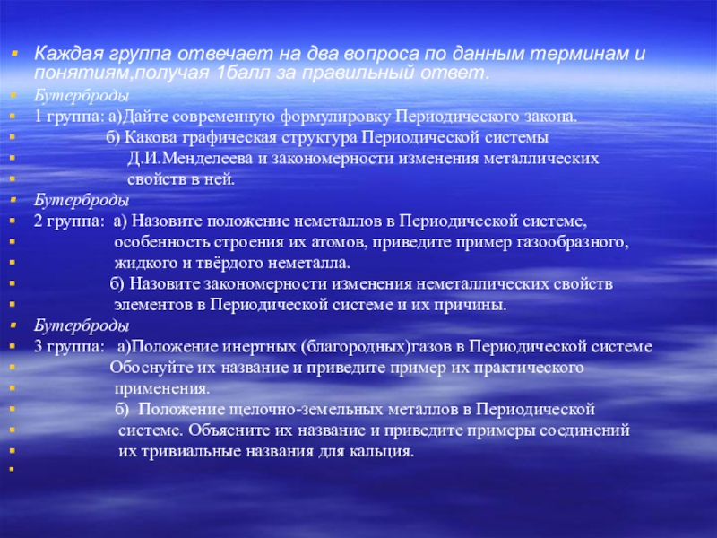 Каждая группа отвечает на два вопроса по данным терминам и понятиям,получая
