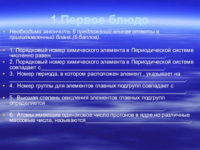 Необходимо закончить 6 предложений,вписав ответы в приготовленный бланк.(6 баллов).