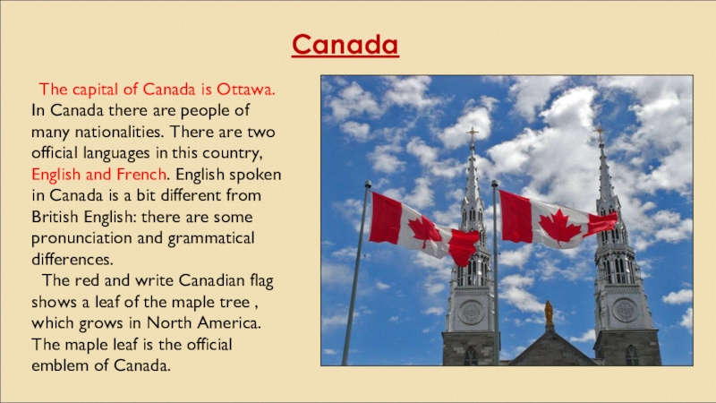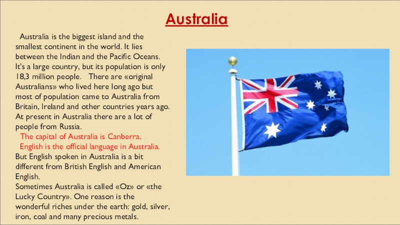 The capital of New Zealand is Wellington. The population of country is mixed. Some people came from Britain many years ago. Some Maori people lived here before the British came. Official languages are English and Maori. But English is spoken in very unusual way in New Zealand. It is often called Kiwi English.