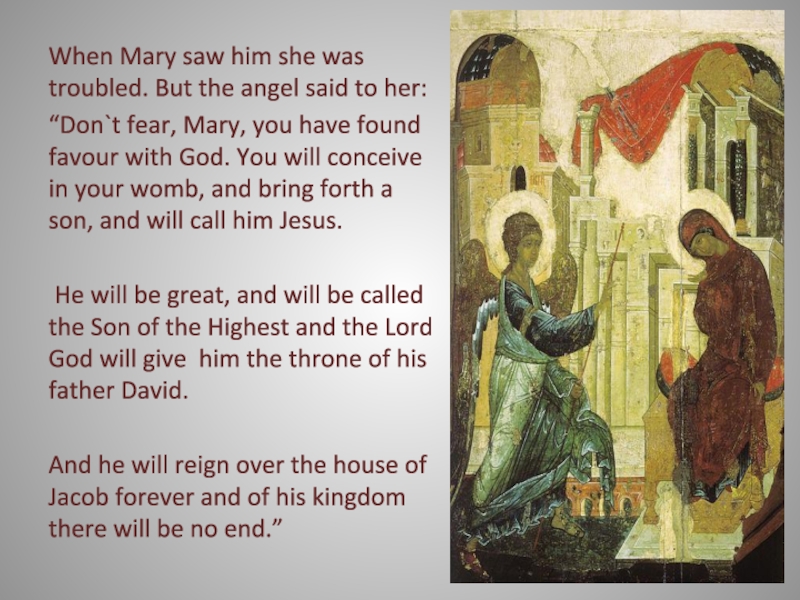 Слайд 4When Mary saw him she was troubled. But the angel said