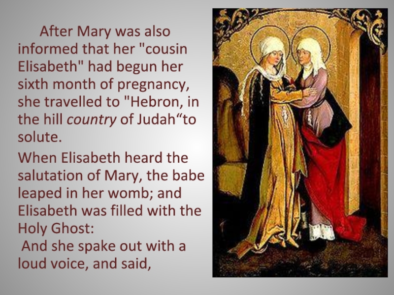Elisabeth" had begun her sixth month of pregnancy, she travelled to "Hebron, in the hill country of Judah“to solute.