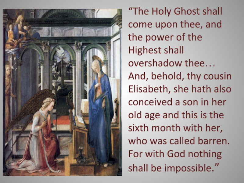 of the Highest shall overshadow thee… And, behold, thy cousin Elisabeth, she hath also conceived a son in her old age and this is the sixth month with her, who was called barren. For with God nothing shall be impossible.”