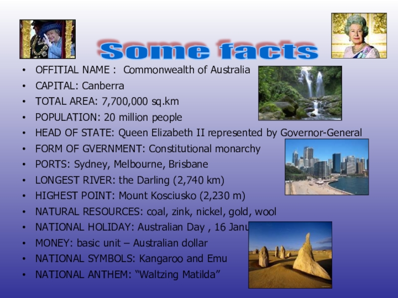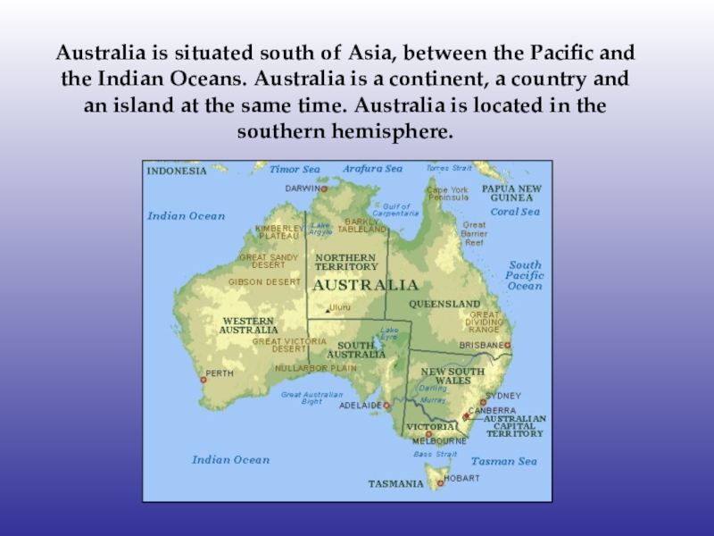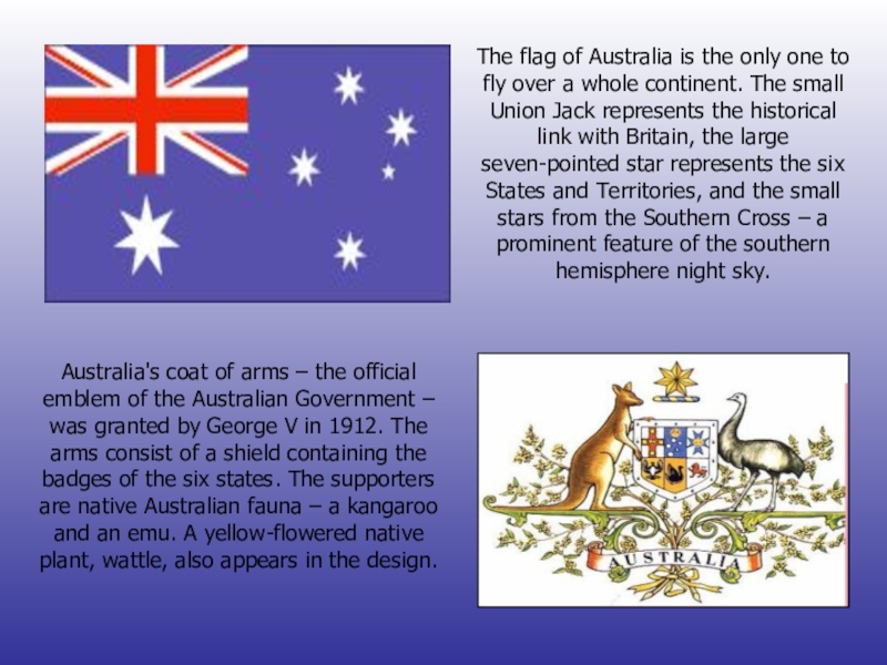 The flag of Australia is the only one to fly over a whole continent. The small Union Jack represents the historical link with Britain, the large seven-pointed star represents the six States and Territories, and the small stars from the Southern Cross – a prominent feature of the southern hemisphere night sky.